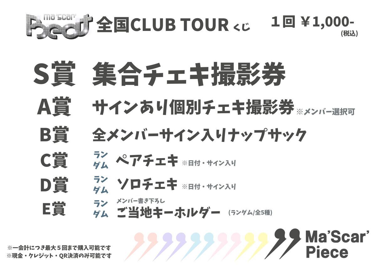 2026年1月31日(土)に開催する「Ma’Scar’Beat 全国クラブツアー」東京公演の特典会では、グループショット撮影会&個別特典会を実施いたします。